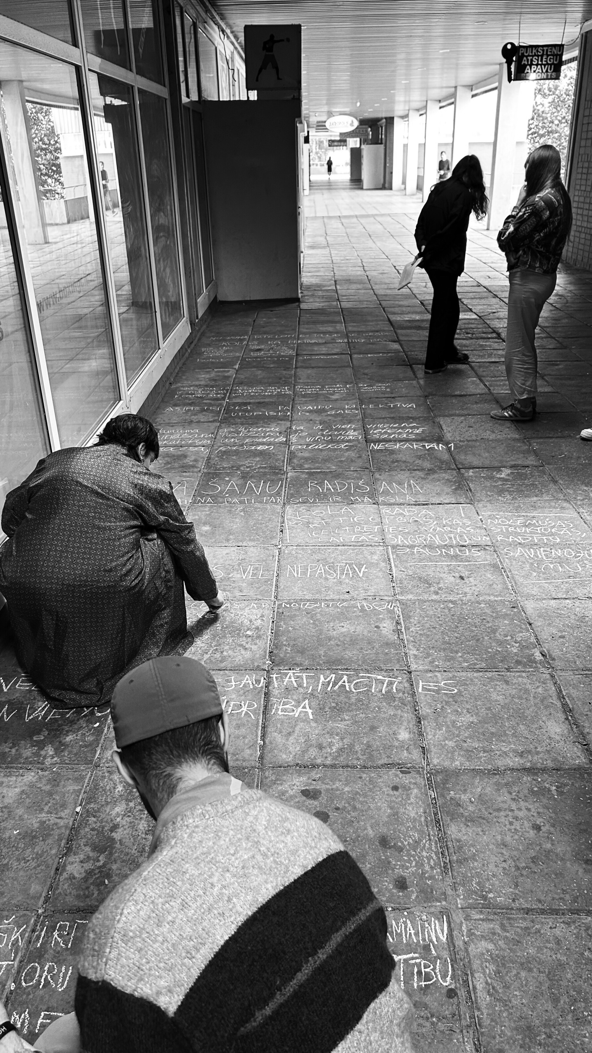 Ar performatīvu uzstādījumu lasījām Silvijas Botiroli tekstu Jūtīgas mācīšanās vieta. Festivāls ir/kā skola un katrs ar krītiņiem izrakstījām to, kas apziņā nosēdies visvairāk. Ievēroju, ka manis izvēlēto «viņu atšķirības kļūst par pārmaiņu katalizatoru, nevis par neērtību un diskomfortu, kuru mīkstināt var tikai kompromiss» kāds jau ir uzrakstījis, un izrakstīju teikuma pirmo daļu: «Uz īsu laiku šeit satiekas svešinieki, lai pulcētos ap noteiktu ideju, interesēm un vēlmēm.» Tikai jau tuvāk skolas beigām sapratīšu, cik zīmīgu vietu procesā iegūs šī pirmās dienas doma.